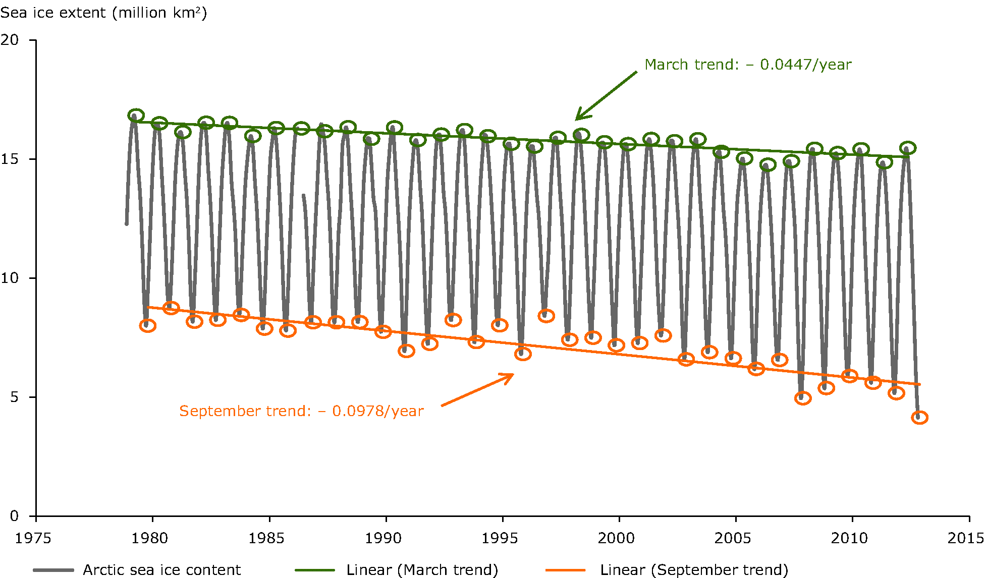 Notice how the winter Arctic ice has barely changed at all. And the overall ice loss is only about 15% (source):